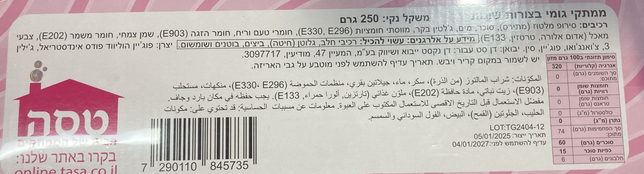 מנורת 3 המשאלות סוכריות 9.6 גרםמטבעות שוקולד לבן להמסה 28% קקאו בד"צ 750 גרםמטבעות שוקולד מריר להמסה 51% קקאו פרווה בד"צ 750 גרםמטבעות שוקולד חלב להמסה 31% קקאו בד"צ 750 גרםקינדר בואנו מיני מיקס 205 גרםעוגיות אוראו במילוי קרם וניל 66 גרםאוראו בראוניז 154 גרםאוראו וניל 154 גרםאוראו קראנצ'י בייטס 110 גרםאוראו גולדן 154 גרםמילקה מיני קוקיז 110 גרםמרשמלו 150 גר – ברבי 24 יחידותמרשמלו 150 גר – גנרי 24 יחידותמרשמלו נקניקייה 10 גרםמארז טסה של בוננזהמארז טסה מיקס מתוקעוגיות מזרחיות בטעם שום בצל 400 גרם אחוהעוגיות מזרחיות עם זעתר 400 גרם אחוהערכה להכנת ממתק DIY טיפות 24 גרםערכה להכנת ממתק DIY בועות ג'לי 17 גרםערכה להכנת ממתק DIY גומי על קשית 15 גרםממתק אבקה מדליקה 12 גרםהנשיקות שלי "דובי" 40 גרםתיק יצירה סוכריות כוכב 60 גרםתיק יצירה סוכריות לב 60 גרםתיק יצירה סוכריות פרח 60 גרםסוכריות קופצות + לקקן - גלידה 10 גרםסוכריות קופצות בום מיקס 4 טעמים 4 גרםאוראו אפרסק 97 גרםאוראו שוקולד חלב 97 גרםערכה להכנת ממתק DIY גלידה 43.5 גרםמלטיזרס צבי ג'ינג'רברד 59 גרםממרח מלטיזרס 200 גרםממרח טוויקס 200 גרםמסטיק חבל 15 ס"מ בטעם אוכמניות 17 גרםמסטיק חבל 15 ס"מ בטעם דובדבן 17 גרםממרח סניקרס 200 גרםשוקולד רושן אורירי לבן 80 גרםמקלות גומי עם ג'לי וסוכריות בטעם פירות 36 גרםמקלות גומי עם ג'לי וסוכריות בטעם פטל ואוכמניות 36 גרםמקלות גומי עם ג'לי חמוץ טעם אבטיח 12 גרםגומי בולז בטעם ענבים 15 גרםגומי בולז בטעם תות 15 גרםגומי בולז בטעם פטל 15 גרםקראנצ'י רואופ בטעם פטל 10 גרםקראנצ'י רואופ בטעם פירות 10 גרםמנטוס קלין ברט פירות יער 90 גרםמנטוס קלין ברט' מנטה 90 גרםSC Renew MembershipSC Join Membershipממתק אצבעוני 7.5 גרםגומי המבורגר גדול+ ג'ל חמוץ 50 גרםגומי המבורגר מיני 10 גרםגומי ואוו בקבוק מסטיק חמוץ 500 גרםגומי ואוו מיני המבורגר 500 גרםגומי ואוו נחש פירות חמוץ 500 גרםגומי ואוו תות שדה קטן חמוץ 500 גרםגומי ואוו כריש אבטיח חמוץ 500 גרםגומי ואוו תות אוכמניות 500 גרםגומי ואוו נחש אנקונדה 500 גרםגומי ואוו כובע טרופי חמוץ 500 גרםראש ג'לי אבטיח 8 גרםסוכ' מנטוס רול יחידה דיסקברי 37.5 גרםאורביט גומי לעיסה ללא סוכר בטעם תפוח 14 גרםראש ג'לי תות 8 גרםראש ג'לי פטל 8 גרםראש ג'לי דובדבן 8 גרםעוגיות טעם חמאה קופסת פח ורדים 114 גרםעוגיות טעם חמאה קופסת פח פרחים 114 גרםרול וופל מאסטר 400 גרםוופל מאסטר גריף 360 גרםגולון מגה שוקו 145ג'מילקה טבלה פטל 100ג'-Kמילקה טבלה אוראו סנדוויץ' 92ג' - Kמילקה טבלה אגוז שלם 95ג'-Kמילקה קייק אנד שוק 175ג'-Kמילקה טבלה צימוק אגוז 90ג'-Kמילקה טבלה דובדבן 100ג' - Kקונוס לבבות שוקולד באהבה 48 גרםלבבות שוקולד בקופסא יהלום 52גרלקקן שוקולד 25 גרם I LOVE YOUסוכריות בטעם קוקוס 250 גרםסוכריות ג'ינגר קוקוס 250 גרםצ'יפס ירקות שורש בטטה 40ג אורגניצ'יפס ירקות שורש סלק 40ג' -אורגניהל משקה אנרגיה קלאסי 250 מלאמ אנד אמס שוקו חום 200ג'- Kסוכריות ג'ילי בוני פרוט 200 גרם SUMMER MIXסוכריות ג'ילי בוני פרוט 200 גרם CITRUS MIXסוכריות ג'ילי בוני פרוט 200 גרם BERRY MIXפופקורן בטעם שוקו 60 גרם OISHIפופקורן בטעם קרמל 60 גרם OISHIפופפולי פופקורן מוכן מלח ים 127 גרםפופפולי פופקורן מוכן פלפל מלח ים 142 גרםפופפולי פופקורן מוכן קרמל 142 גרםפופפולי פופקורן מוכן גבינה נאצו 142 גרםפופפולי פופקורן מוכן צדר לבן 142 גרםפופפולי פופקורן מוכן מתוק מלוח 142 גרםפופפולי פופקורן מוכן צדר חלפיניו 142 גרםפופפולי פופקורן מוכן מרשמלו 142 גרםפופפולי פופקורן מוכן חמאה 142 גרםקינדר בואנו דארק בודד 43 גרםגונץ בוטנים קלויים עם מלח 150 גר'מנטוס שקית מנטה 135 גרםמנטוס שקית פירות 135 גרםמארז מקלות ביסקוויט עם שוקולד חלבי 150 גרםזריפה גרעיני דלעת 250 גרםזריפה גרעיני אבטיח 200 גרםקרפט רוטב ברביקיו אורגינל 510 מ"לפבורס טראפל לבן פיסטוק 100ג'פבורס טראפל שוקו 100ג'פבורס טראפל לבן וניל 100ג'פבורס טראפל בלגי 400ג'אנרג'י מאגדת דגנים טראפלס ושוקולדאנרג'י מאגדת תחתית מרירנסקוויק אבקת תות 350ג'גולון טוסטדה ללא ת.סוכר 175ג'גולון טוסטדה ללא סוכר 350ג'גולון א